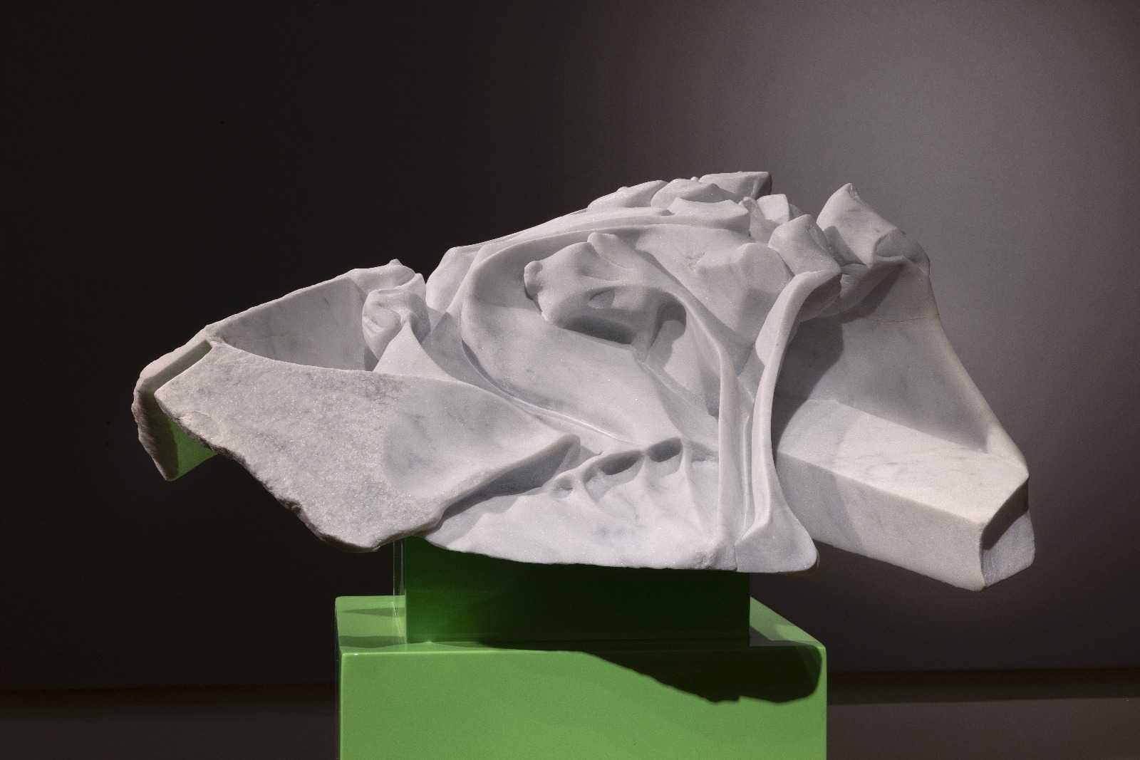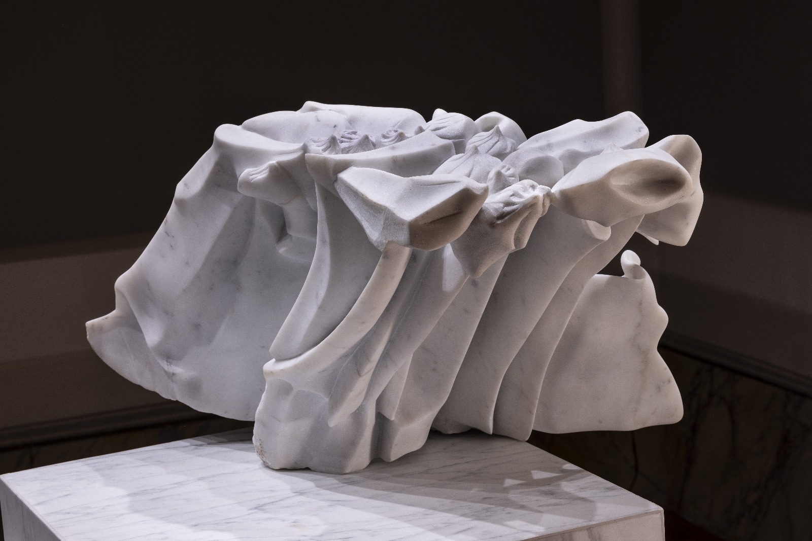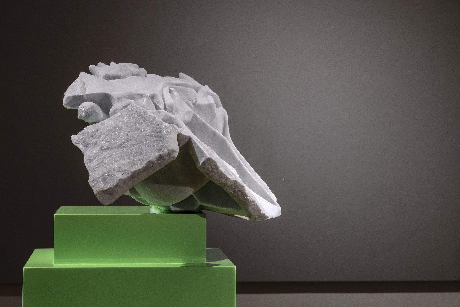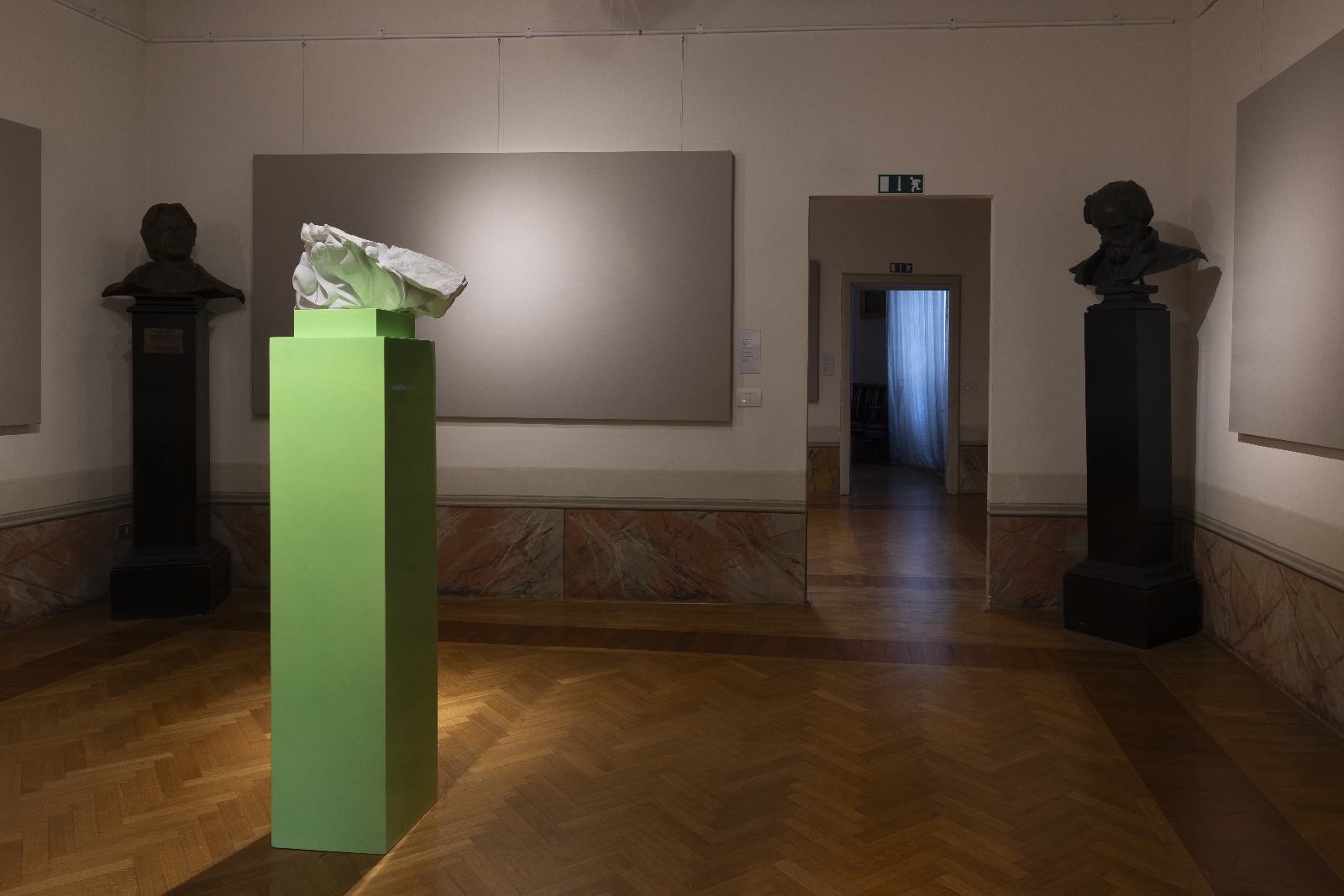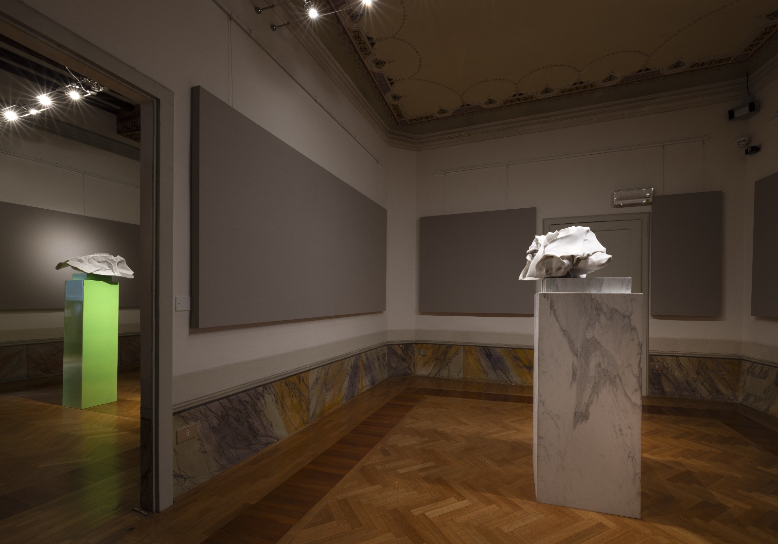 In questa dimensione i pannelli di supporto espositivo lasciati neutri alle pareti e illuminati direttamente assumono il ruolo di “silenziatori visivi” della forma risultante dalla scultura. Silenziare la forma, qui, è restituirla focalizzata nella sua multiformità. Una cortesia visiva che genera un nuovo ascoltare attraverso il vedere.