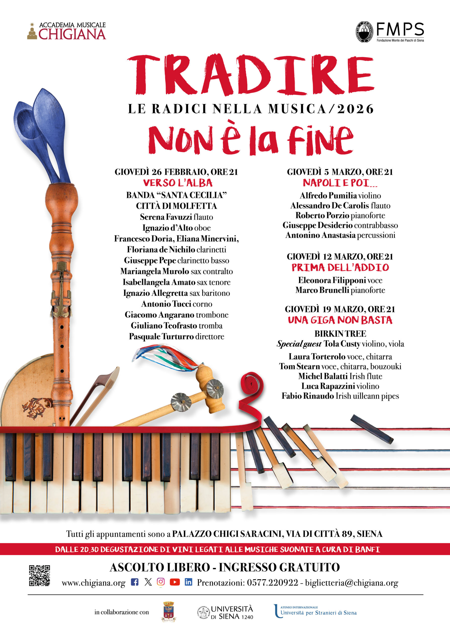 Ogni storia ci trasforma, attraversa soglie, margini, confini. Ma ogni volta che ci si arresta sulla linea di passaggio, si sa che la strada non finisce e il cammino proseguirà anche al di là di noi. Nel 2026 Tradire – Le radici nella musica arriva alla decima edizione, con la convinzione che le sue memorie continueranno in ogni modo a ramificarsi e fiorire. Non è la fine.