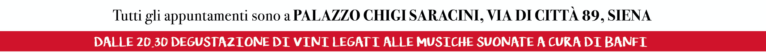 Come di consueto, prima di ogni appuntamento a partire dalle 20:30 nel foyer di Palazzo Chigi Saracini, avremo l’occasione di degustare vini che condividono le radici con le musiche suonate. Quest’anno le degustazioni sono a cura di Banfi, azienda che ha saputo legare i vigneti, le tradizioni vinicole dei territori toscani e piemontesi con le tecniche enologiche più avanzate e una competenza imprenditoriale che ha permesso a prodotti eccellenti di raggiungere efficacemente mercati in ogni parte del mondo. Per ogni appuntamento un vino della produzione Banfi verrà descritto e offerto al pubblico in modo che possa apprezzare le caratteristiche in comune con le musiche della serata, tessendo un filo fra l’esperienza dell’ascolto, della vista, del gusto e dell’olfatto.